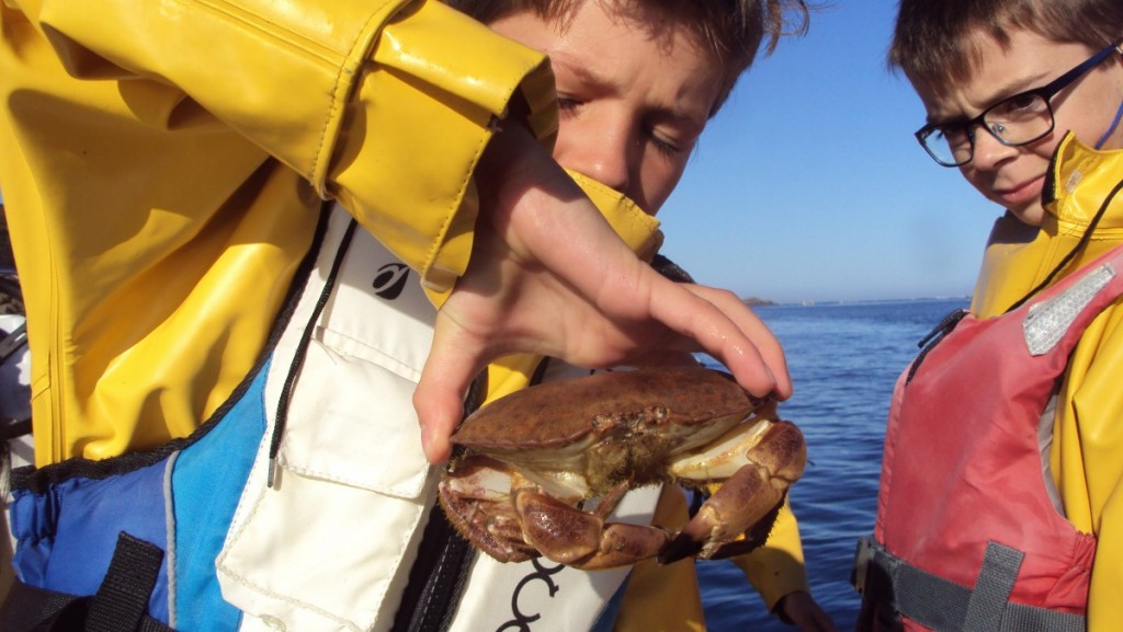 Belle journée ensoleillée, et oui c’est possible en Bretagne…Programme de cette journée: ce matin nous sommes allés faire un tour en bateau à moteur vers les iles puis nous avons relevé les 2 casiers et le filet de pêche posés la veille par Pierrot et Goul. Des tourteaux, qu’on a relachés, quelques étrilles et une sole…La pêche n’a pas été miraculeuse mais on pu observé les animaux pêchés et vivre en direct les relevés des casiers et du filet. L’après-midi, catamaran.Le vent était faible, la grand voile et le foc n’étaient pas de trop pour faire avancer les bateaux.En fin d’après-midi, les 2 animateurs, Najet et Stéphane les ont emmenés sur une plage pour une activité Land art et Photos. Juste avant le repas, nous avons écrit des lettres.