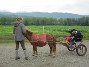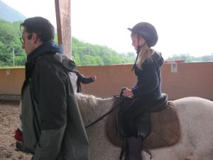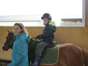 Dans le manège, nous sommes montés sur les poneys. Il fallait avancer au pas, au trot, s’arrêter, tourner….