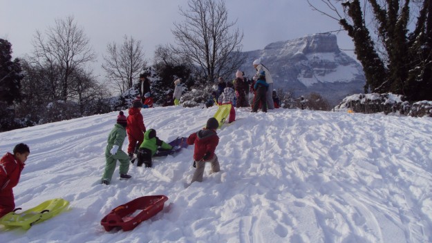 Ce matin on a fait de la luge. On est passé par les vignes, puis sur une petite route et nous avons trouvé deux grosses bosses. Nous avons commencé par la plus petite qui était recouverte de neige poudreuse. Les luges n’allaient pas très vite. Puis, nous avons damé la neige et ça descendait bien…