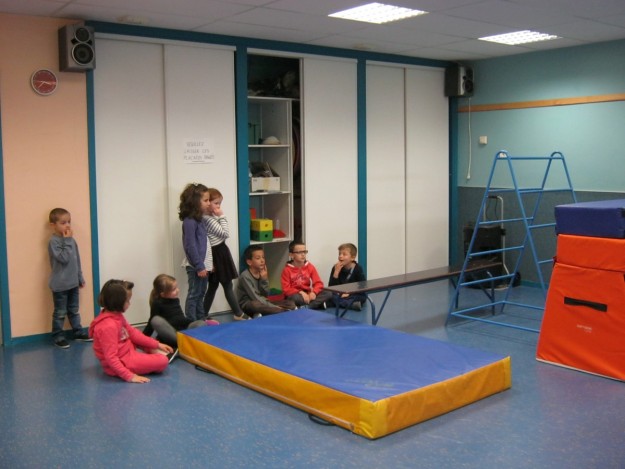 Dans la grande salle de motricité, nous inventons des parcours de débrouillardise. En petits groupes nous construisons chacun une partie puis nous réajustons s’il y a trop de queue quelque part. Nous n’oublions pas les tapis pour la sécurité ! Et après on s’amuse bien !!!